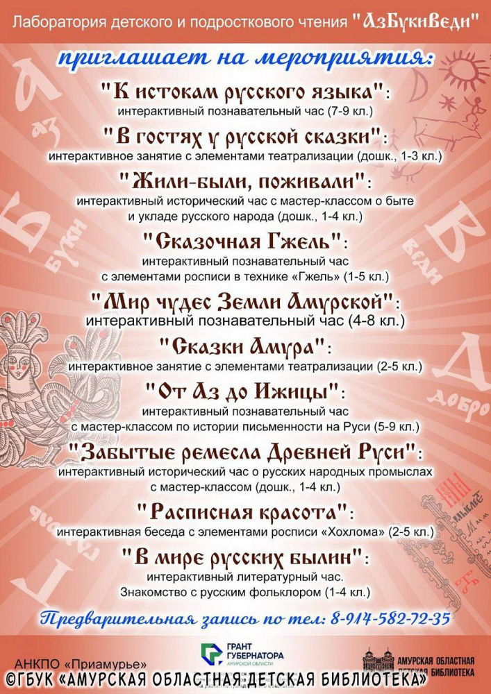 АНКПО «Приамурье» приглашает ребят в Амурскую областную детскую библиотеку в октябре и ноябре на познавательные мероприятия в рамках проекта «Лаборатория детского и подросткового чтения «АзБукиВеди».