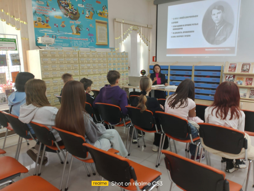 в Амурской областной детской библиотеке для учеников 7«В» класса школы №27 прошёл патриотический час «Творец Великой Победы».
