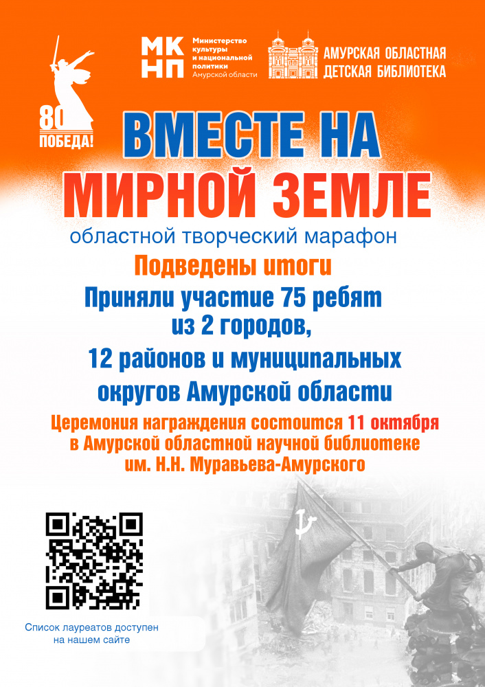 В конкурсах областного творческого марафона «Вместе на мирной земле» приняли участие 75 человек из 2 городов – Благовещенска и Шимановска, 12 районов и муниципальных округов – Архаринского, Благовещенского, Бурейского, Зейского, Ивановского, Магдагачинского, Михайловского, Ромненского, Свободненского, Серышевского, Селемджинского, Тамбовского.