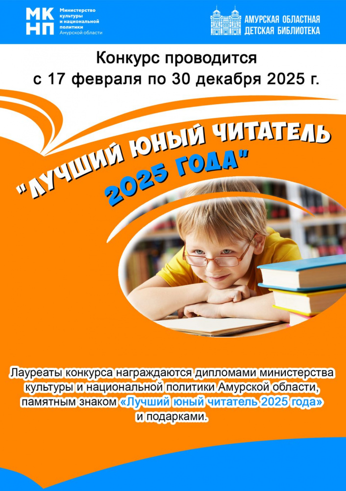 Торжественная церемония награждения лауреатов областного конкурса «Лучший юный читатель 2025 года» дипломами министерства культуры и национальной политики, памятным знаком «Лучший юный читатель 2025 года» и подарками состоится 6 декабря 2025 года в Амурской областной научной библиотеке им. Н.Н. Муравьева-Амурского.