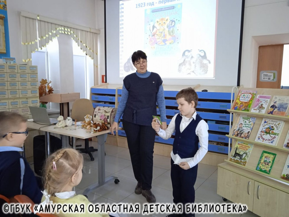 11 ноября первоклассники Прогимназии посетили в библиотеке литературный час «Давайте знакомые книжки откроем». Ребята познакомились с биографией и творчеством поэта, а затем отправились в увлекательное путешествие по страницам его книг. Узнали, какие зверята у Маршака живут в зоопарке, прочитали стихи из «Веселой азбуки», а также поучаствовали в викторине «Угадай-ка».