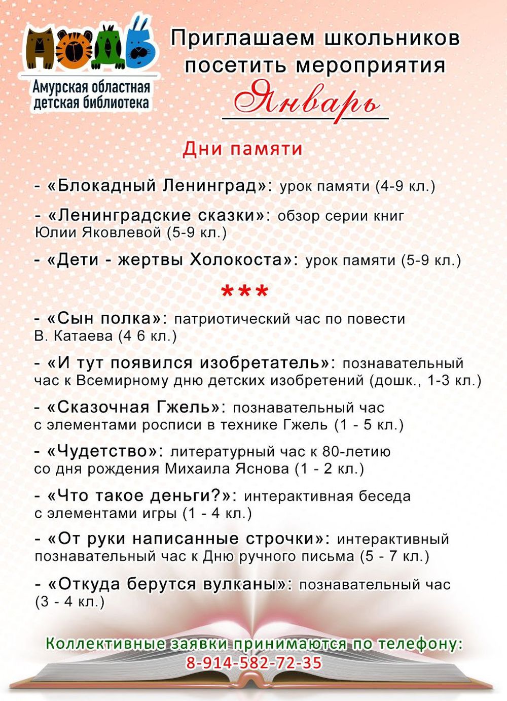 В Амурской областной детской библиотеке с 26 января по 26 февраля проходит месячник памяти «Навеки в памяти народной». Приглашаем ребят и взрослых на познавательные мероприятия, посвященные Дням во...