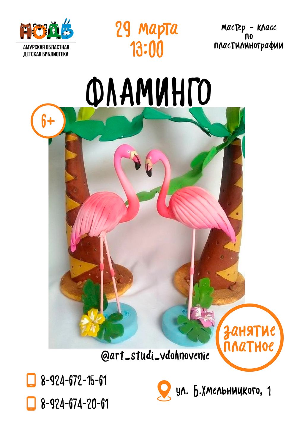 29 марта приглашаем детей на мастер-класс по пластилинографии «Фламинго» (6+). БУДЕМ РАЗВИВАТЬ: мелкую моторику; сенсорный интеллект; критическое мышление; фантазию и воображение. Время...