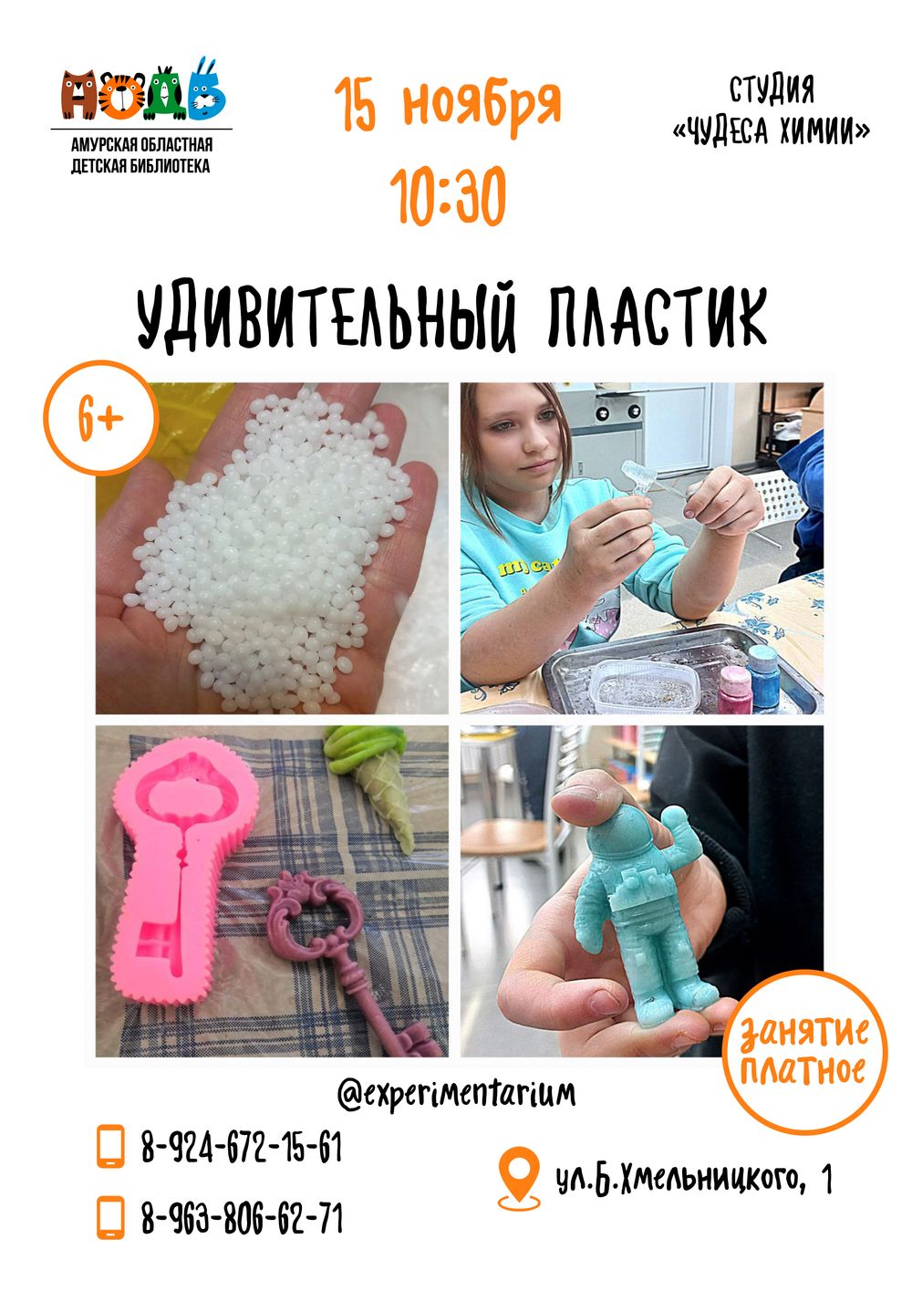 15 ноября приглашаем юных экспериментаторов на занятие «Удивительный пластик» ( 6+). Узнаем из чего делается пластик, от чего зависят его свойства. Сделаем игрушки или брелоки в силиконовых молда...