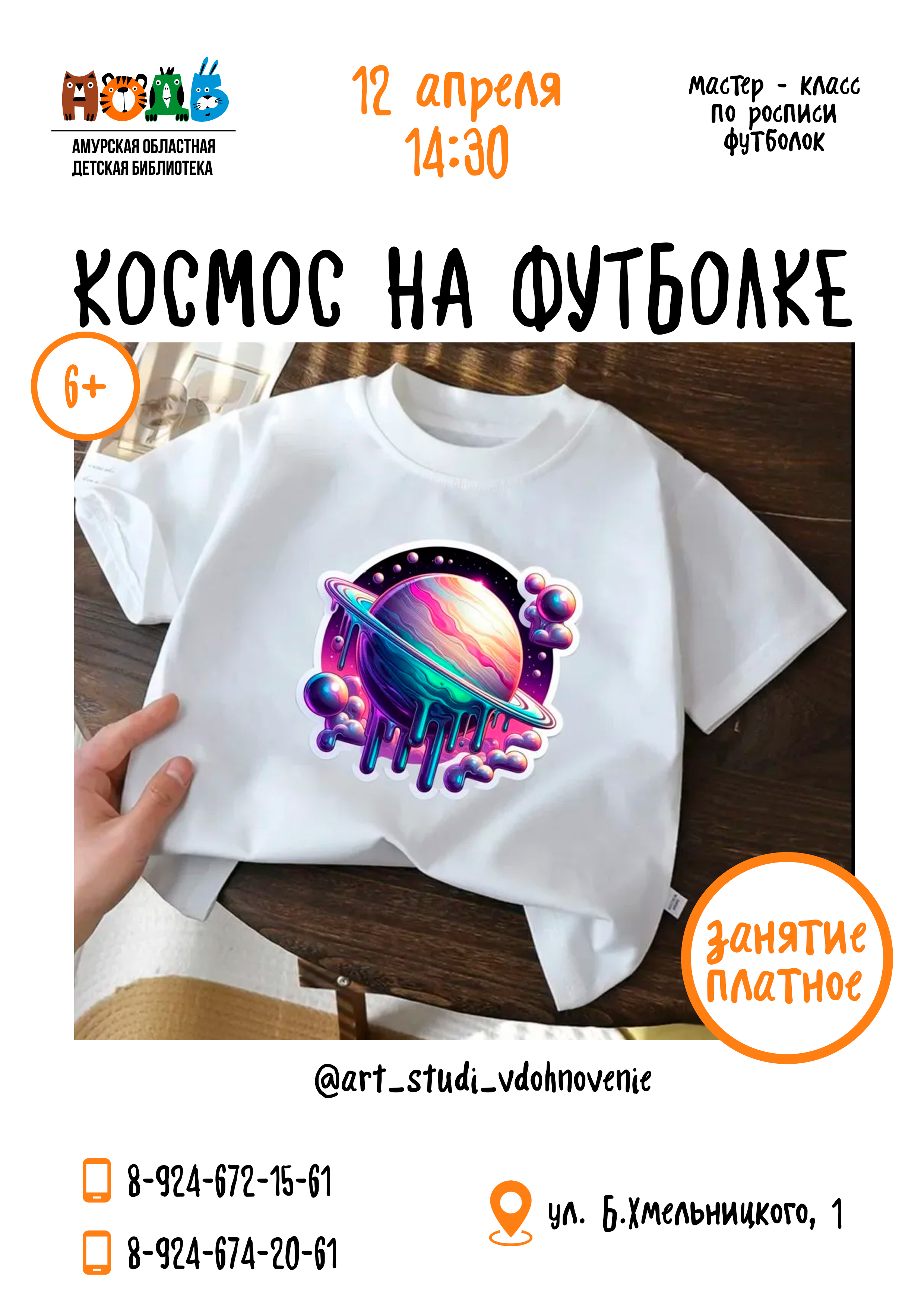 Приглашаем всех, кто мечтает о звёздах на мастер-класс, где вы сможете создать свою уникальную футболку с космическим дизайном (6+). ЧТО ВАС ЖДЁТ: - Знакомство с техниками нанесения рисунка на тк...