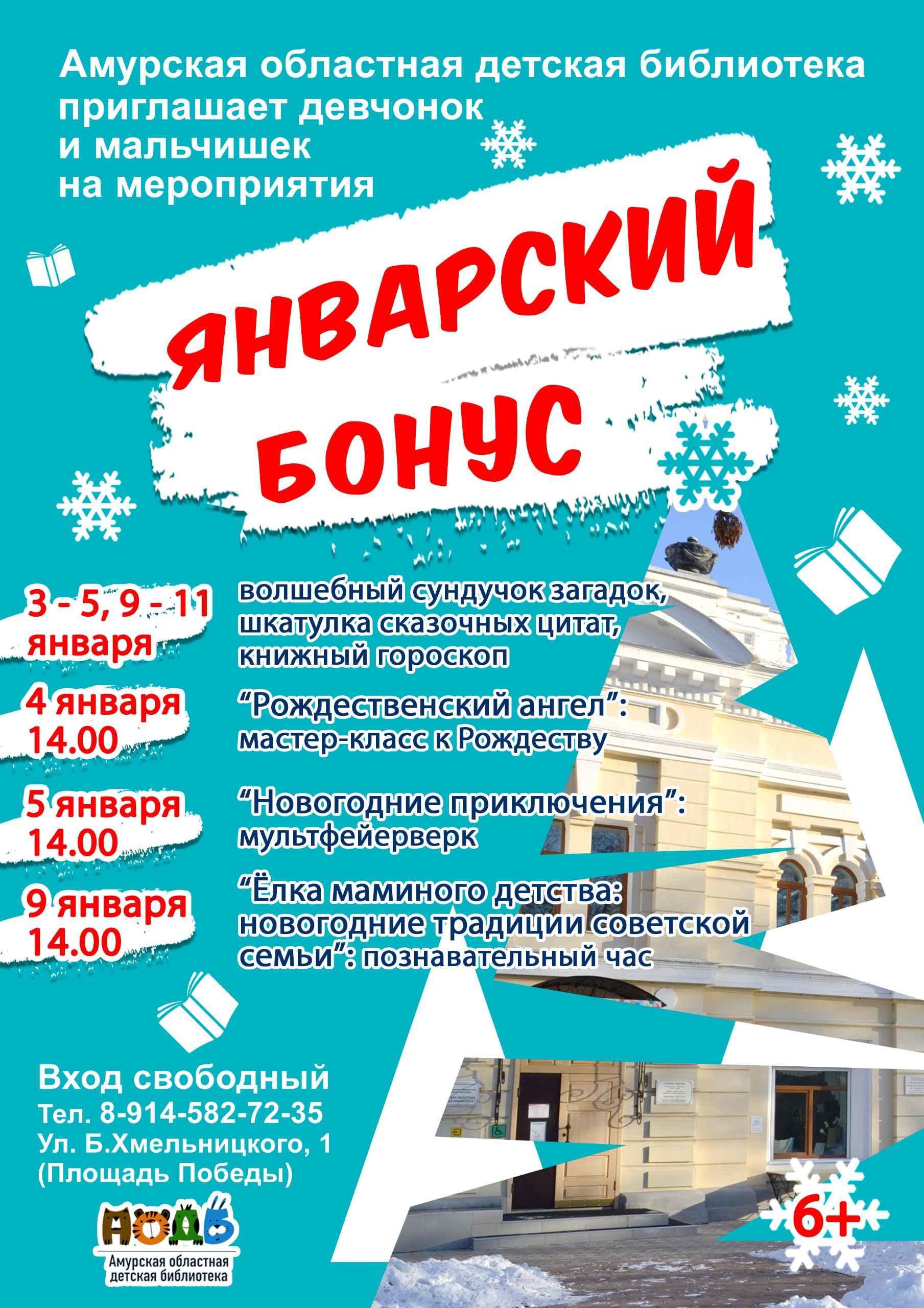 Дорогие друзья! В новогодние праздничные дни Амурская областная детская библиотека ждёт своих юных читателей! Предлагаем всем принять участие в новогодней акции «Январский бонус». Книжное предска...