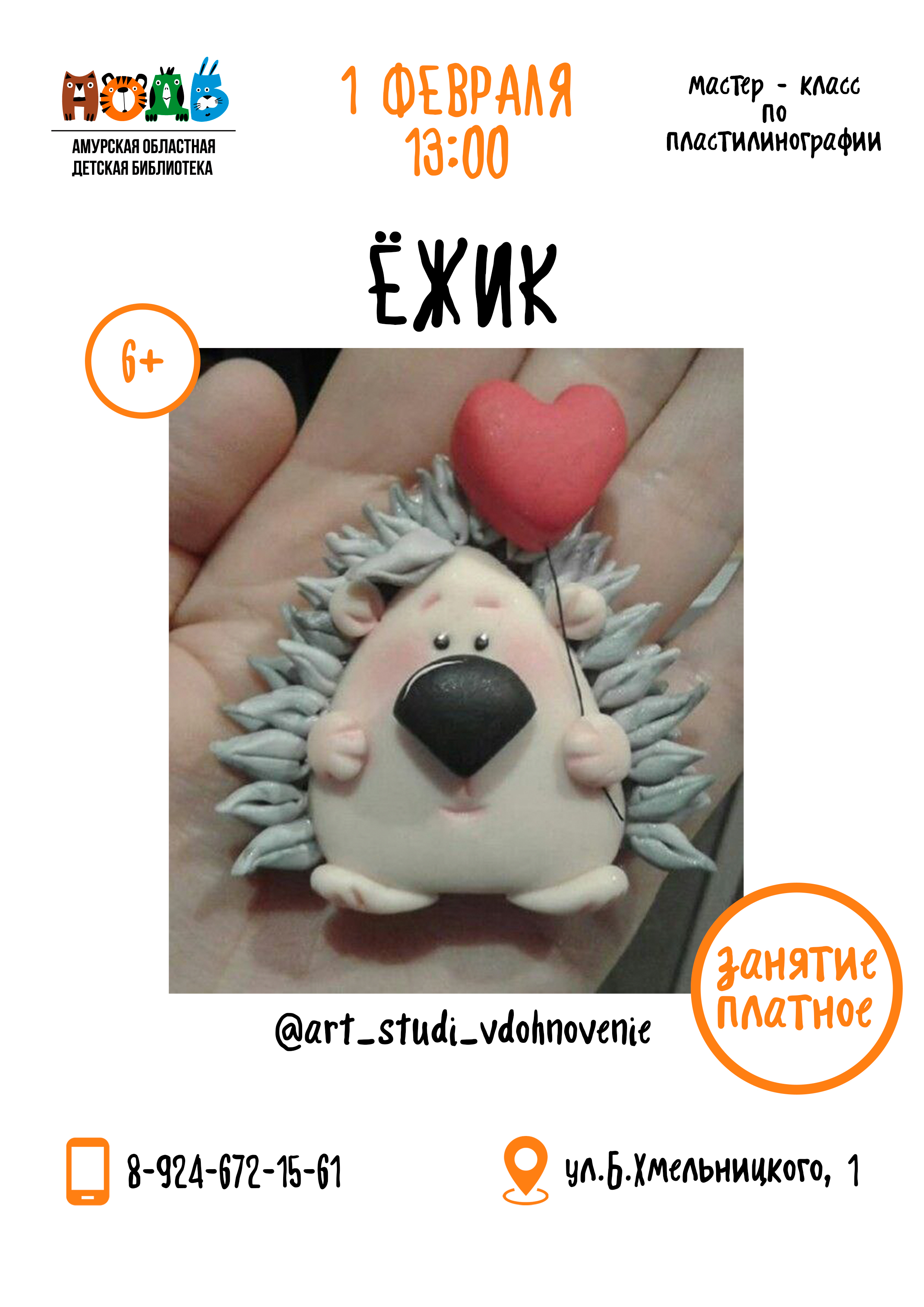1 февраля приглашаем детей на мастер-класс по пластилинографии «Ёжик» (6+). БУДЕМ РАЗВИВАТЬ: - мелкую моторику; - сенсорный интеллект; - критическое мышление; - фантазию и воображение. ...