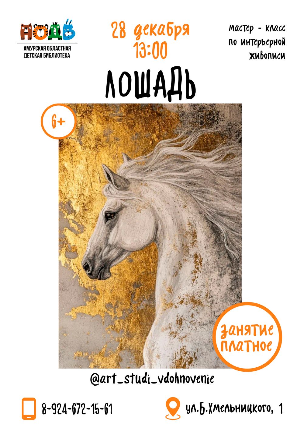 28 декабря приглашаем детей на мастер-класс по интерьерной живописи «Лошадь» (6+). Мастер-класс подходит для всех уровней подготовки поэтому не стесняйтесь участвовать. Вас ждёт увлекательный уро...