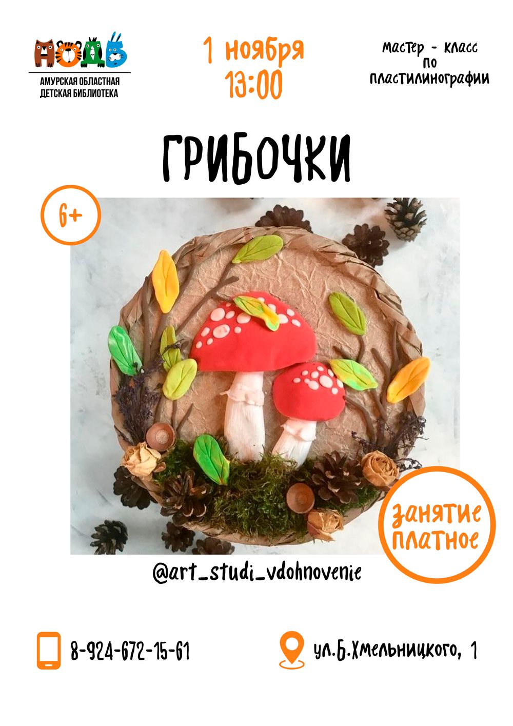 01 ноября приглашаем детей на мастер-класс по лепке из пластилина «Грибочки» (6+). БУДЕМ РАЗВИВАТЬ: - мелкую моторику; - сенсорный интеллект; - критическое мышление; - фантазию и воображен...