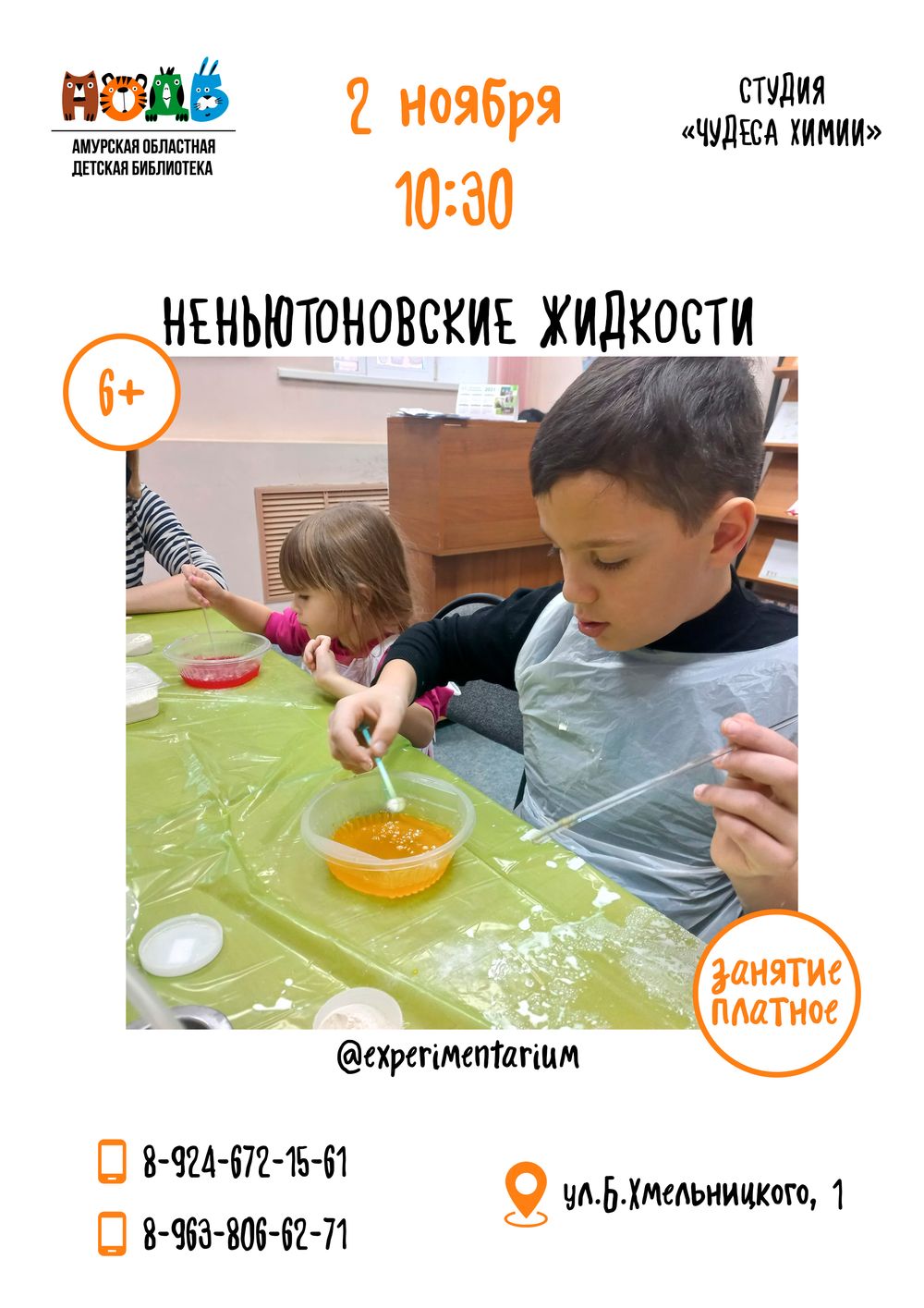 02 ноября приглашаем юных экспериментаторов на занятие «Неньютоновские жидкости» ( 6+). Мы узнаем в чем секрет слаймов, поймём, почему некоторые жидкости можно скатать в шар или порвать. Сделаем ...