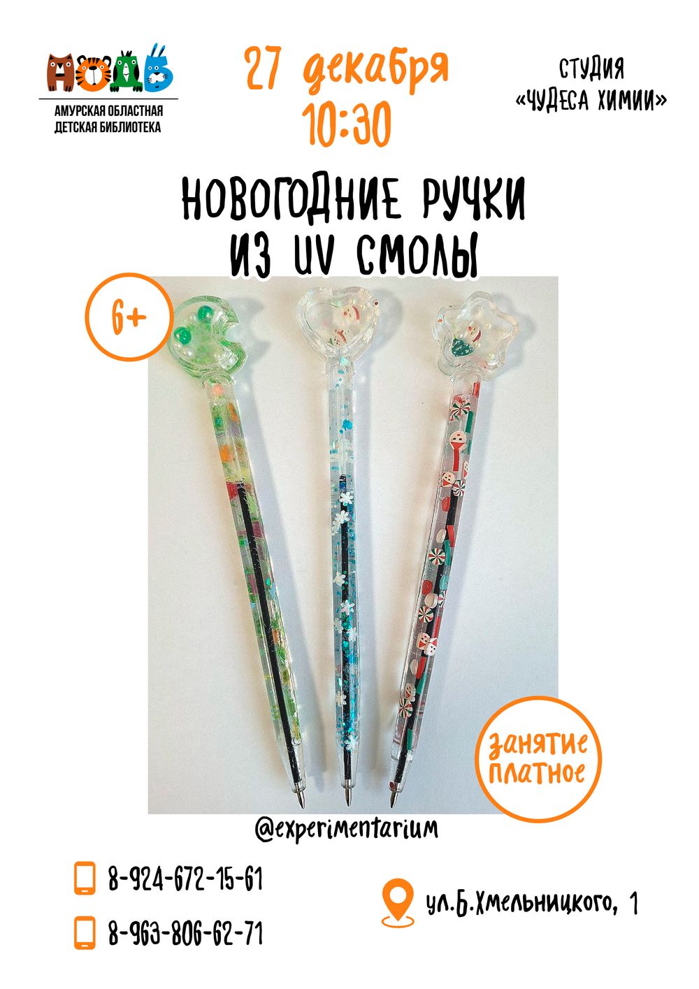 27 декабря приглашаем юных экспериментаторов на занятие «Новогодние ручки из UV смолы с отсеком, в котором плавают украшения» (6+). Заливаем в силиконовые формы UV – смолу; украшаем блёстками, фимо...