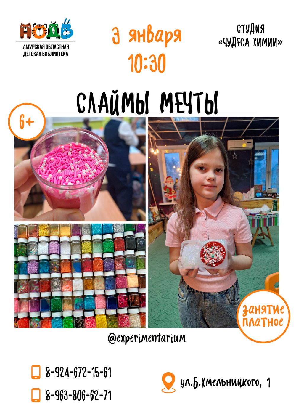 3 декабря приглашаем юных экспериментаторов на занятие «Делаем слаймы мечты» (6+). Делаем 3 слайма: два - на основе прозрачного клея, один - на основе белого. Огромное количество пигментов, арома...