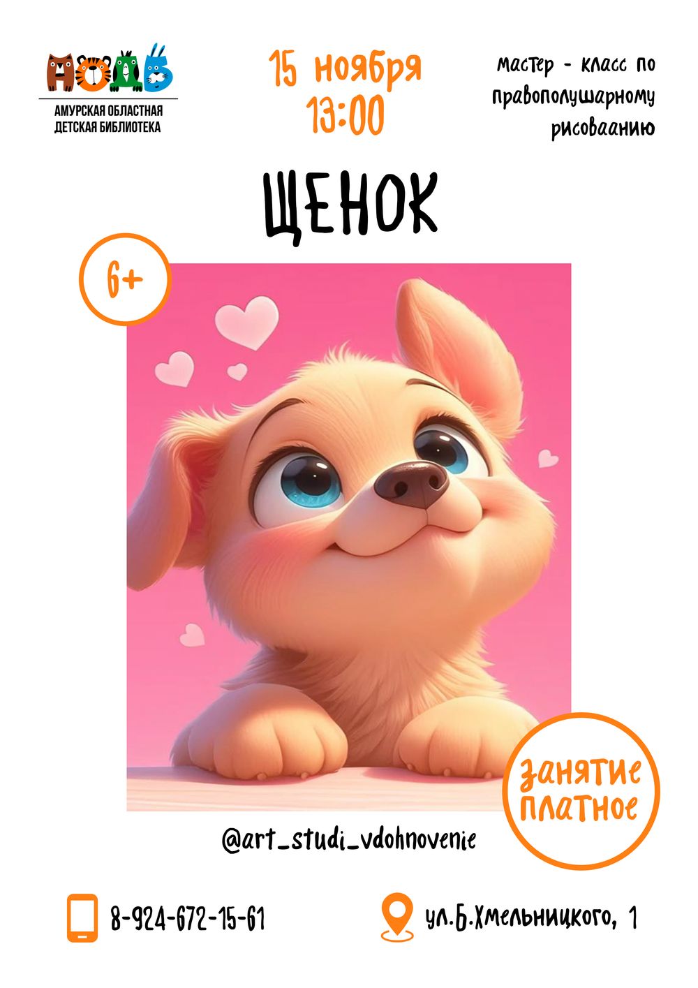15 ноября приглашаем ребят и взрослых на мастер - класс по правополушарному рисованию «Щенок» (6+). Никаких особенных художественных способностей от участников не требуется! Использоваться будут ...