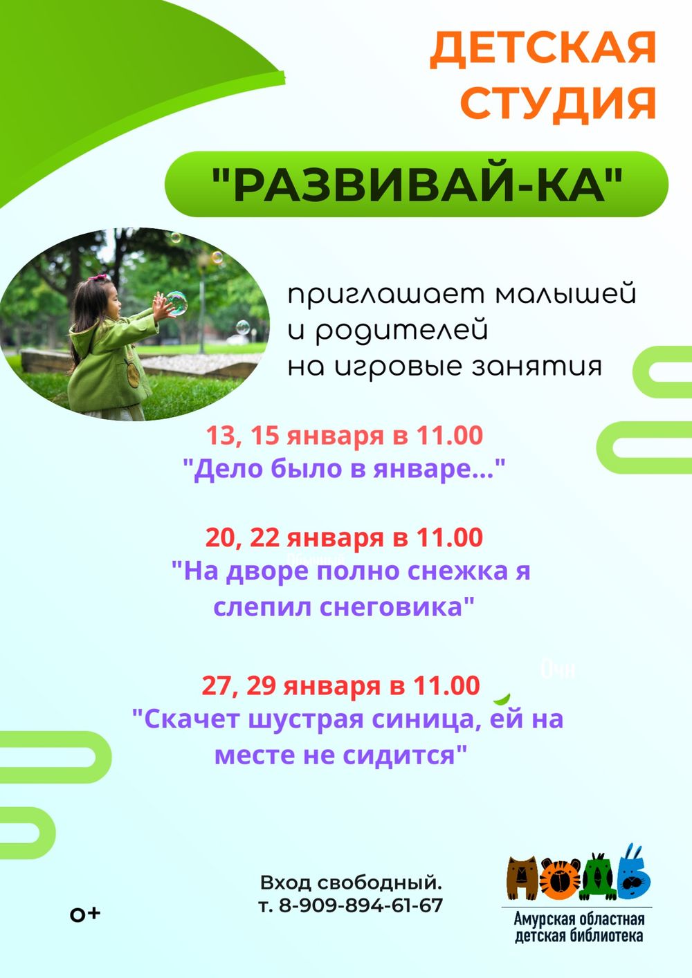 Амурская областная детская библиотека приглашает родителей с детьми от 2-х до 4-х лет на игровые занятия детской студии «Развивай-ка». ЗАНЯТИЯ ВКЛЮЧАЮТ: - музыкально - ритмические упражнения; ...