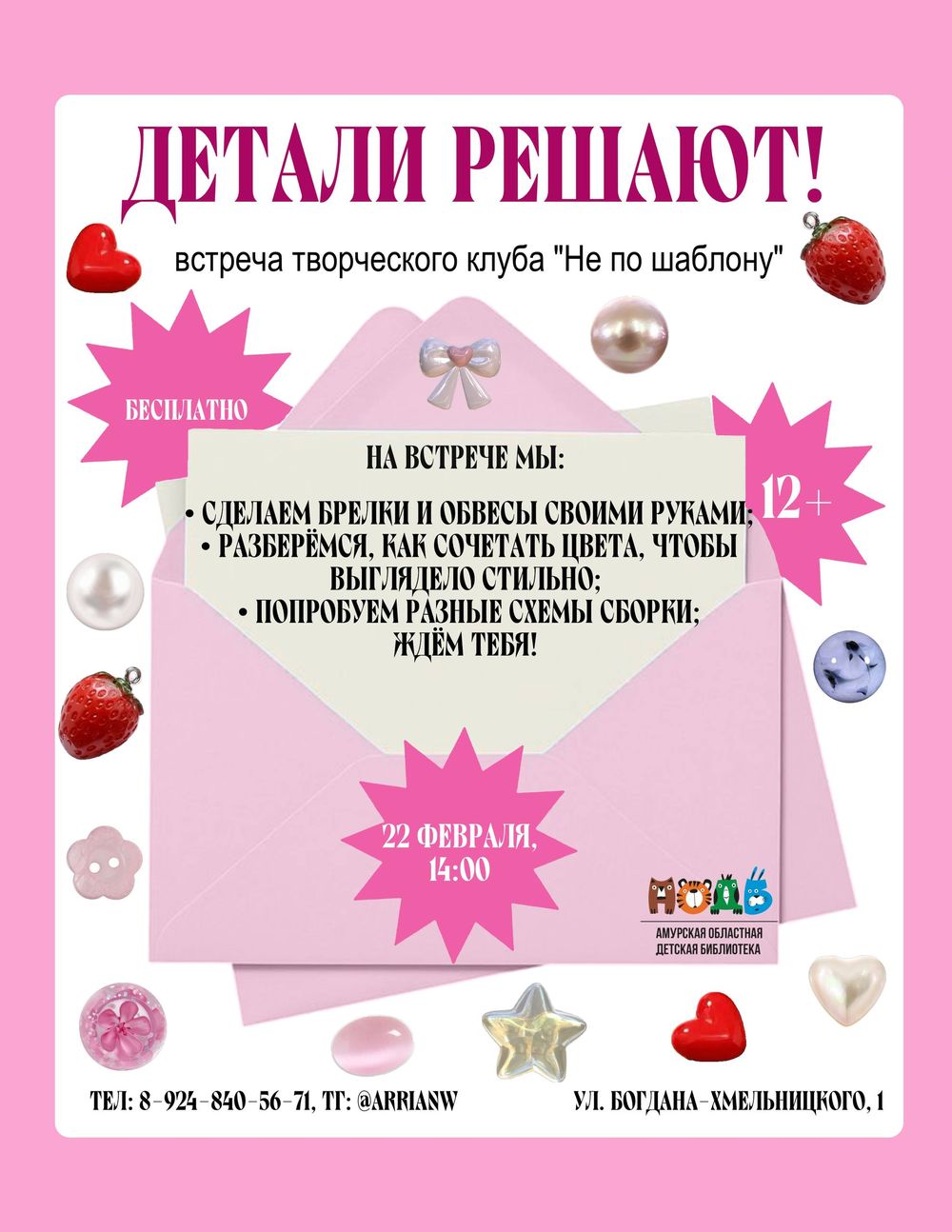 Дорогие друзья! Творческий клуб для подростков «Не по шаблону» продолжает работу — и мы приглашаем вас на вторую встречу! Встреча «Детали решают» пройдет 22 февраля в 14:00. На этот раз будем ...
