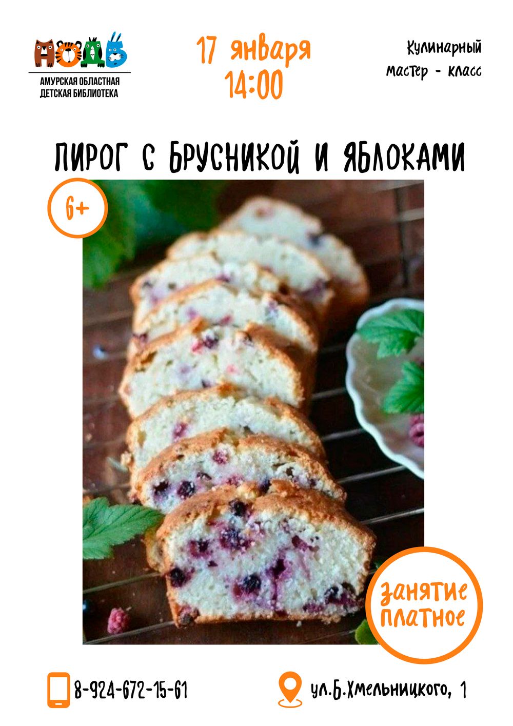 17 января приглашаем ребят на кулинарный мастер-класс «Пирог с брусникой и яблоками» (6+). Зима - самое время научиться готовить не только вкусную, но и полезную выпечку! Мы приглашаем вас на зан...