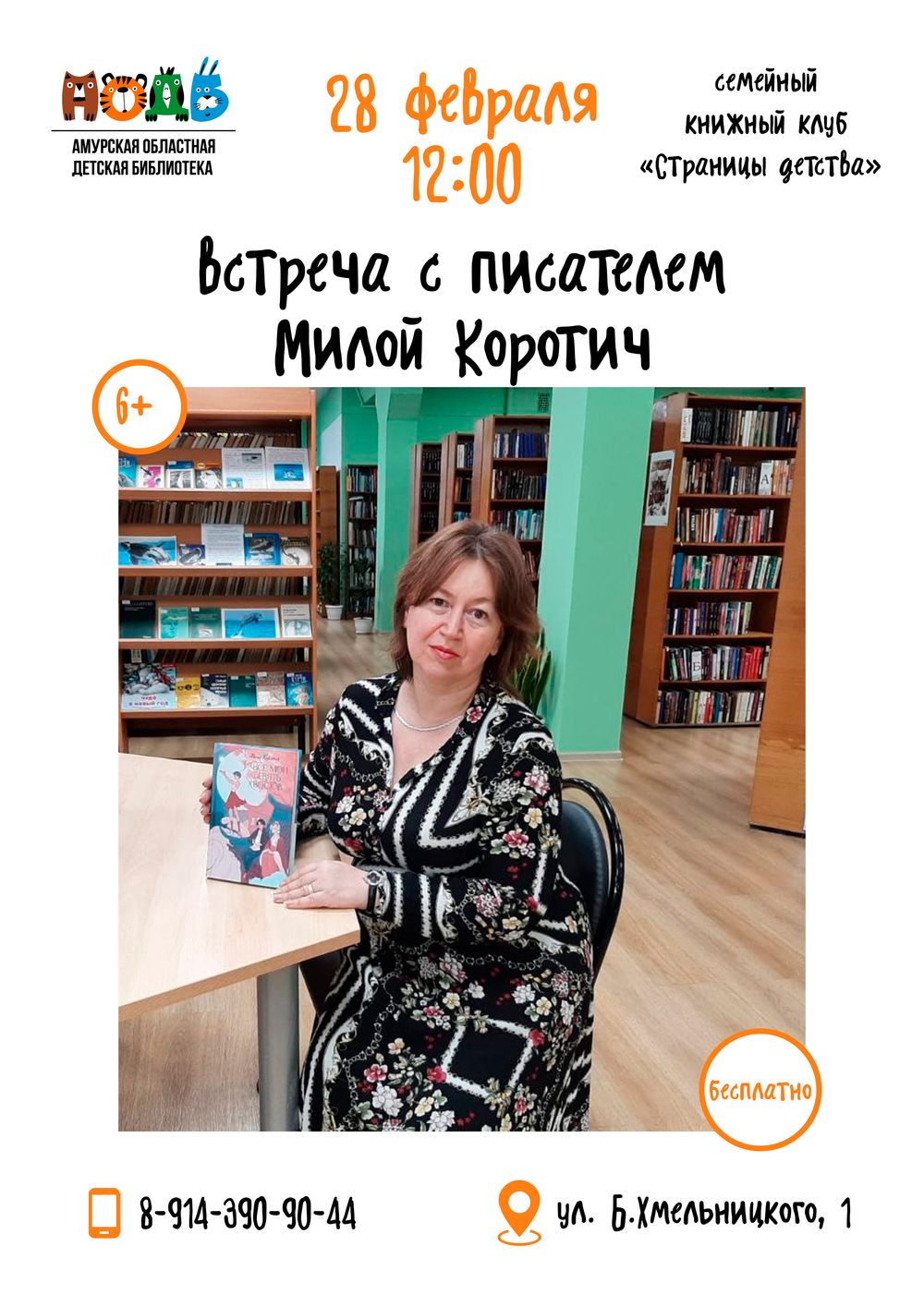 В последний день зимы на встречу семейного книжного клуба придёт писатель Мила Коротич – амурчанка, чьи произведения выходят в крупнейших издательствах России: Эксмо и АСТ. Мила Коротич не только т...