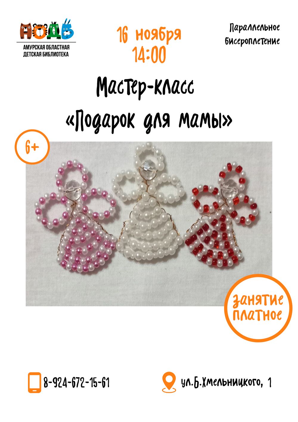 16 ноября приглашаем детей от 6 лет познакомиться с параллельным бисероплетением. В этот раз дети будут плести подарок для мамы. Приходите сами и приводите своих друзей, ведь вместе веселее. Вр...