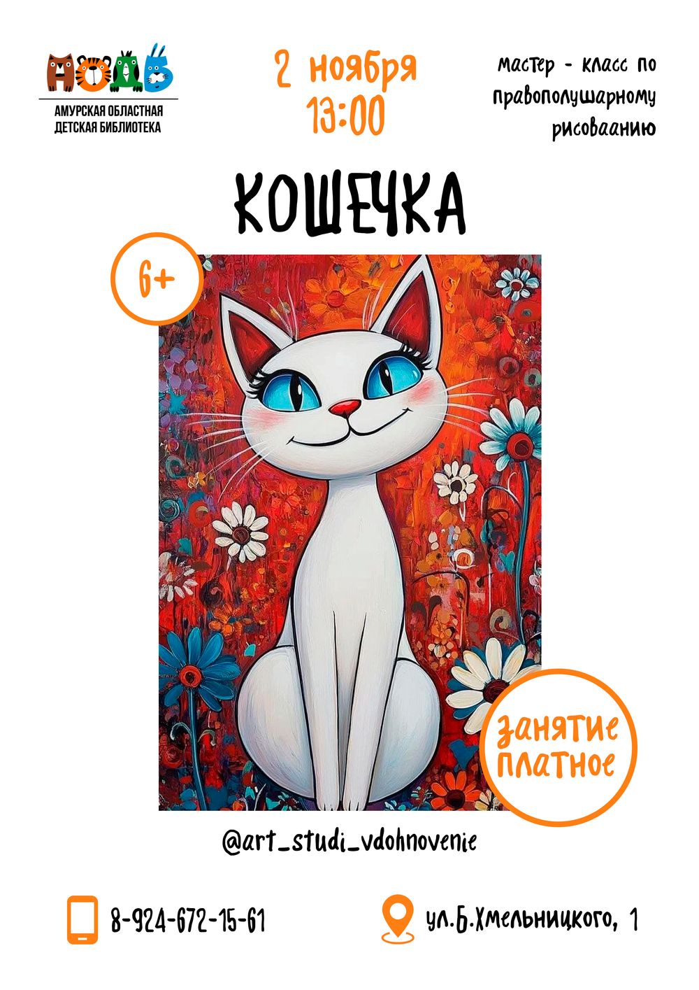 02 ноября приглашаем ребят и взрослых на мастер - класс по правополушарному рисованию «Кошечка» (6+). Никаких особенных художественных способностей от участников не требуется! Использоваться буду...