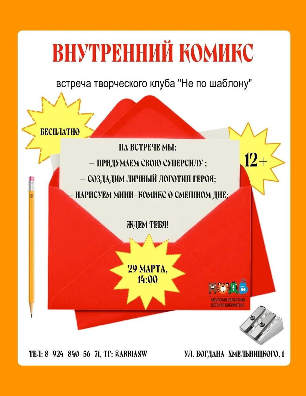 Тема — «Твой внутренний комикс». Будем придумывать свою суперсилу (настоящую, без плащей и лазеров), создавать личный логотип героя и рисовать мини-комикс о смешном или «провальном» дне. Рисовать...