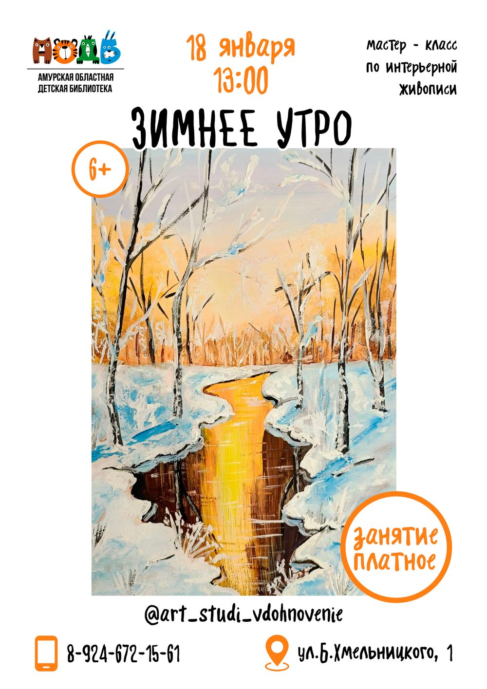 18 января приглашаем детей на мастер-класс по интерьерной живописи «Зимнее утро» (6+). Мастер-класс подходит для всех уровней подготовки поэтому не стесняйтесь участвовать. Вас ждёт увлекательный...