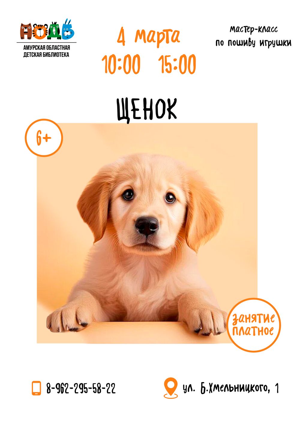Приглашаем детей на мастер-класс «Щенок» (6+). Воплотим свою мечту о верном друге в жизнь Сошьем милого щенка Разовьем мелкую моторику, терпение, аккуратность Поверим в себя и убедимся, что ш...