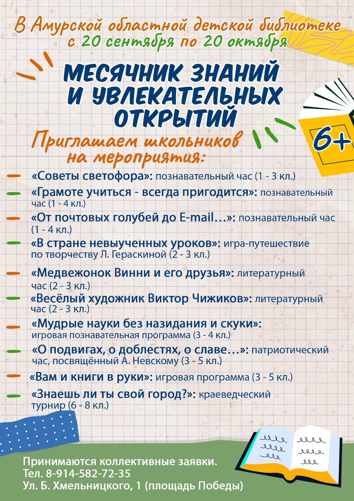 Уважаемые педагоги! В Амурской областной детской библиотеке по традиции с 20 сентября по 20 октября проводится Месячник знаний. Приглашаем школьников на интересные и познавательные мероприятия...