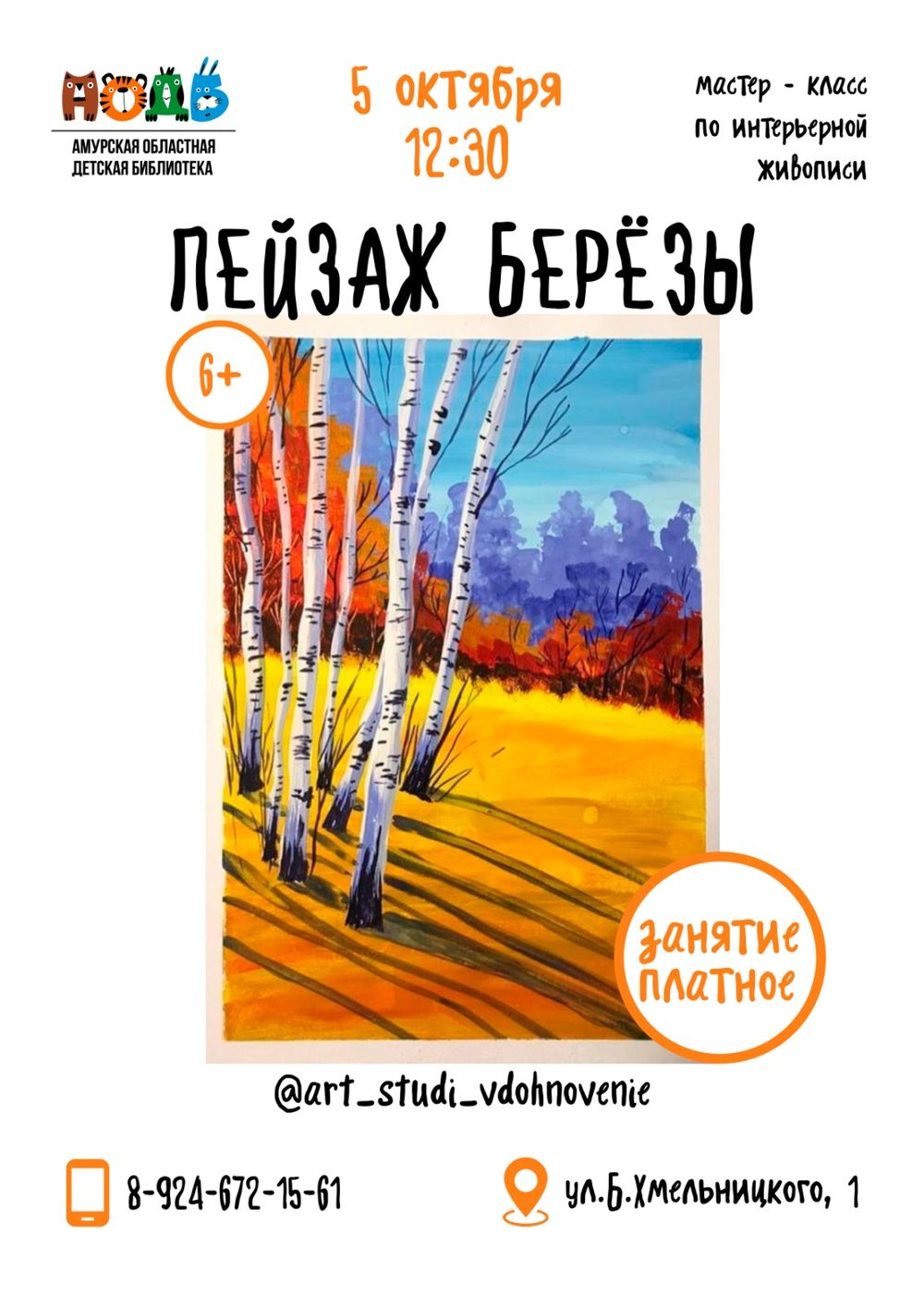 5 октября приглашаем детей на мастер-класс по интерьерной живописи «Пейзаж берёзы» (6+). Мастер-класс подходит для всех уровней подготовки поэтому не стесняйтесь участвовать. Вас ждёт увлекательн...