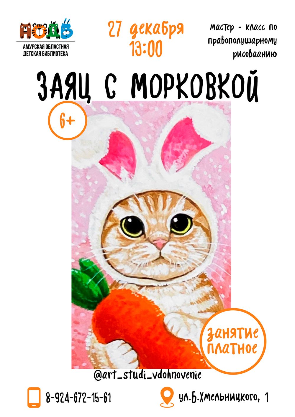 27 декабря приглашаем ребят и взрослых на мастер - класс по правополушарному рисованию «Заяц с морковкой» (6+). Никаких особенных художественных способностей от участников не требуется! Использов...