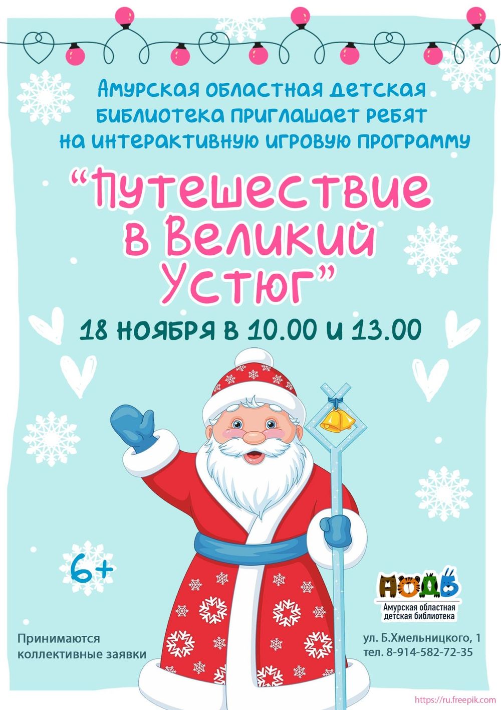 Амурская областная детская библиотека приглашает ребят отправиться в виртуальное путешествие в «Великий Устюг — резиденцию Деда Мороза». Интерактивная игровая программа предназначена для дошкольник...
