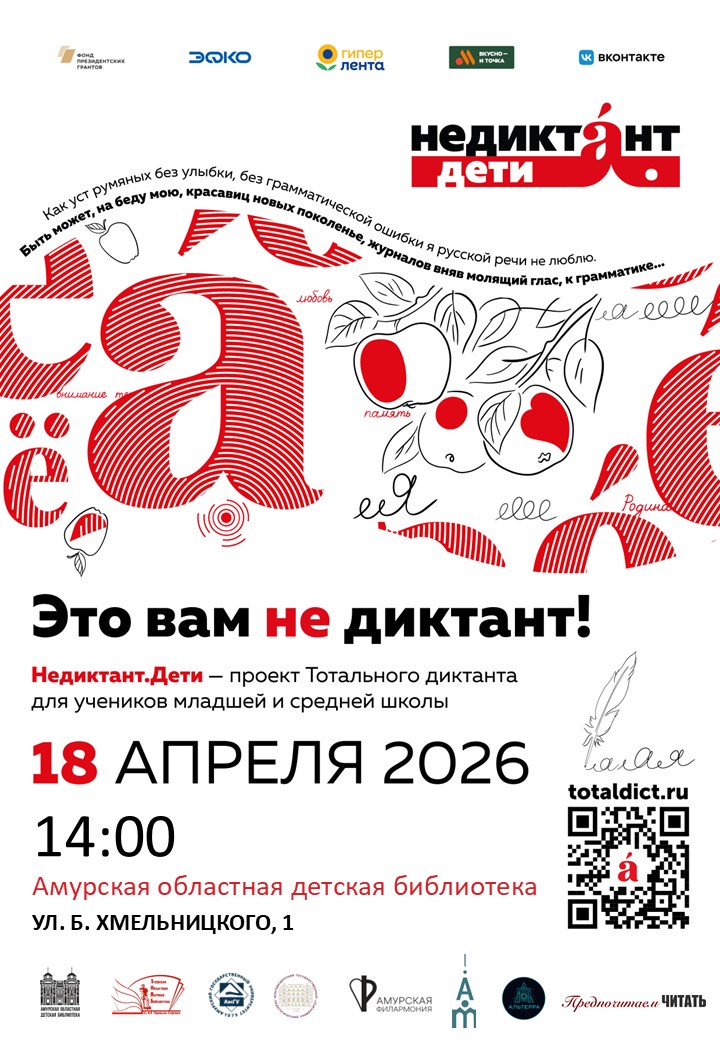 Уважаемые дети и родители! 18 апреля в 14:00 в Амурской областной детской библиотеке пройдёт Всероссийская акция «Недиктант. Дети». Мероприятие состоится уже во второй раз и вновь объединит увлеч...