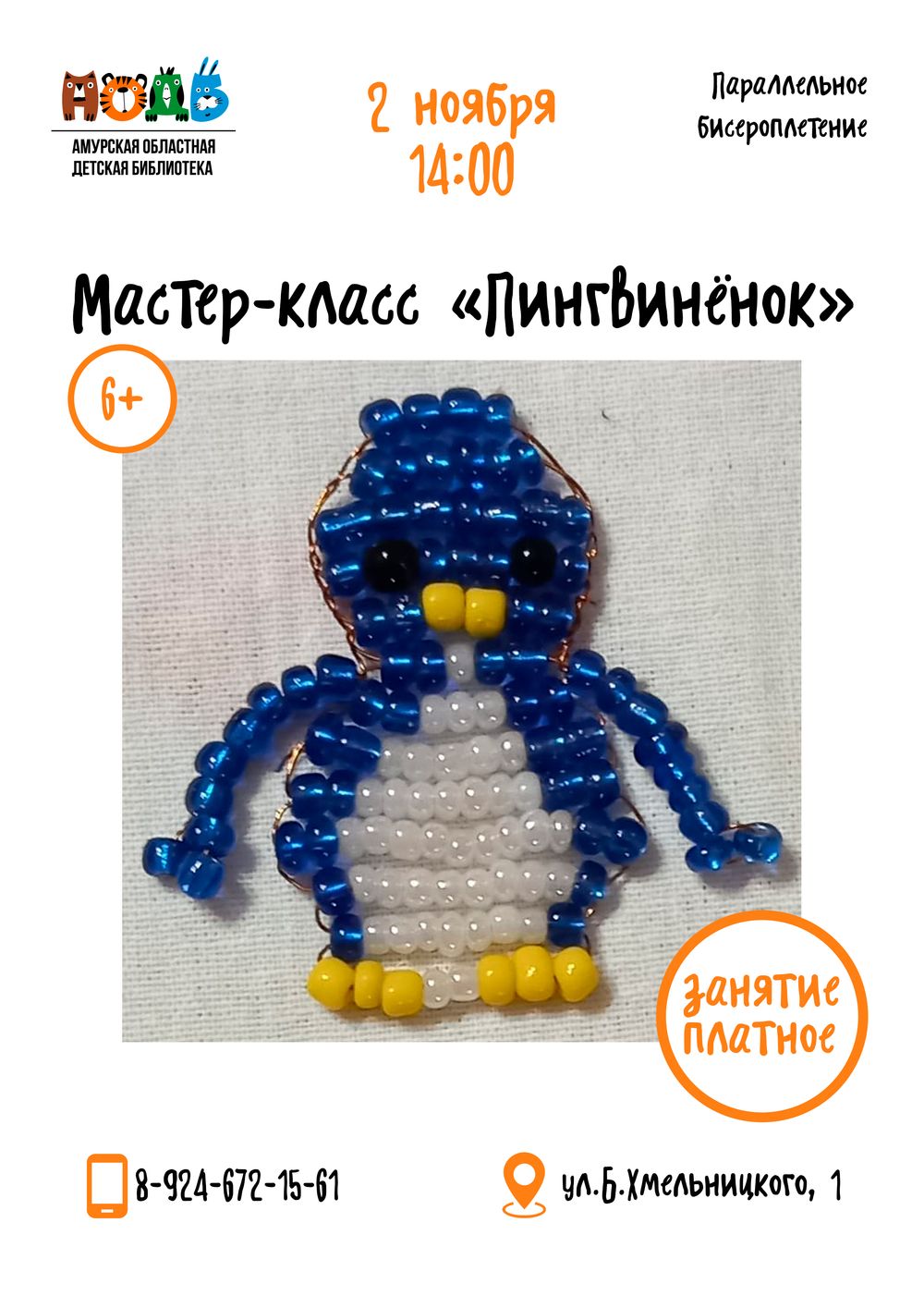 02 ноября приглашаем детей от 6 лет познакомиться с параллельным бисероплетением. В этот раз дети будут плести пингвинёнка для своей коллекции. Приходите сами и приводите своих друзей, ведь вмест...