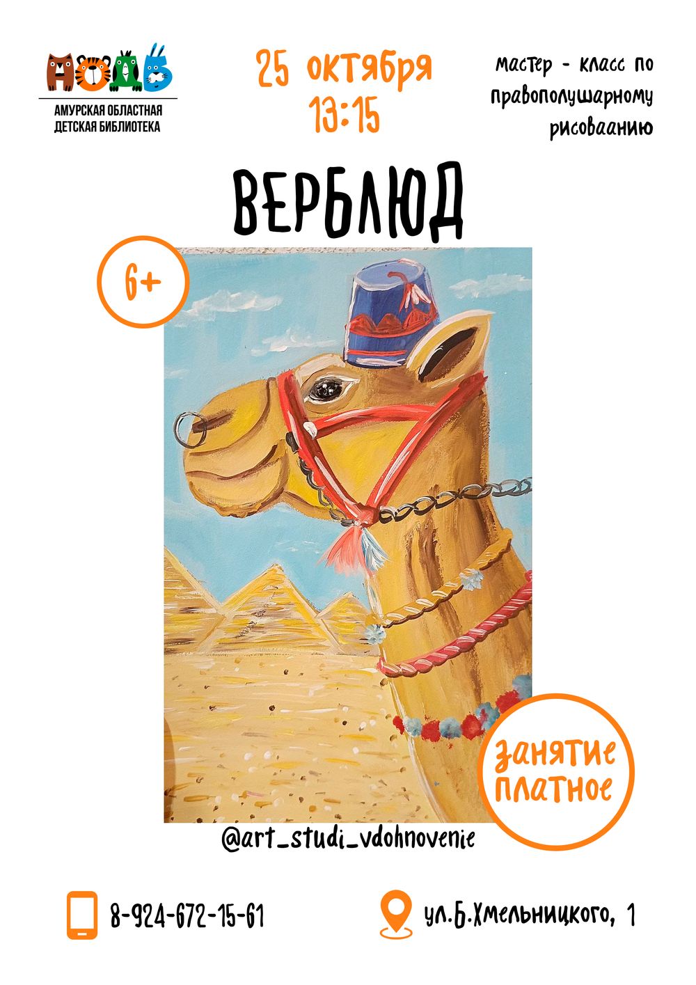 25 октября приглашаем ребят и взрослых на мастер - класс по правополушарному рисованию «Верблюд» (6+). Никаких особенных художественных способностей от участников не требуется! Использоваться буд...