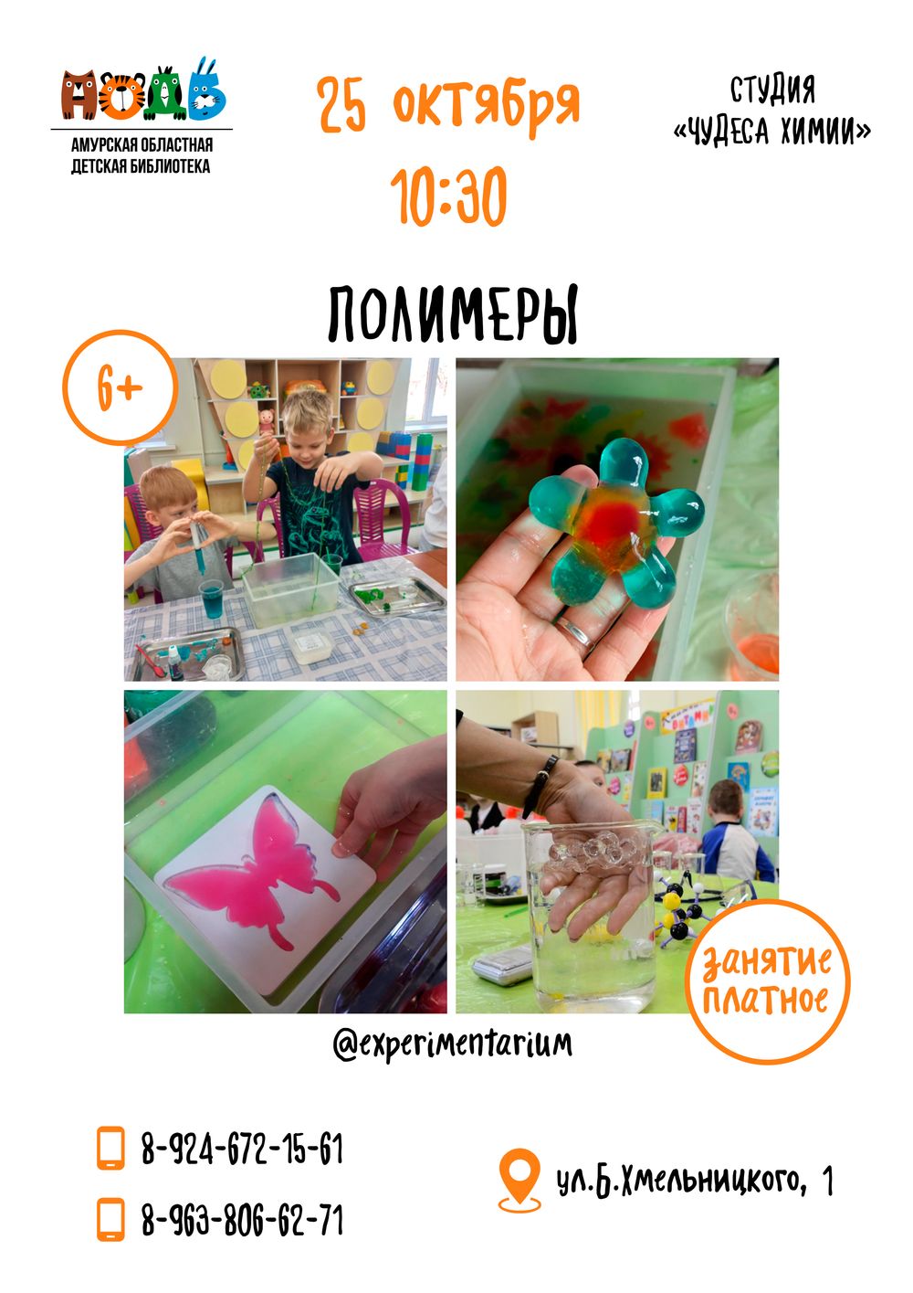 25 октября приглашаем юных экспериментаторов на занятие «Полимеры» ( 6+). Юные экспериментаторы узнают, что общего между тефлоном и ДНК, приготовят огромные спагетти и множество забавных фигур из а...