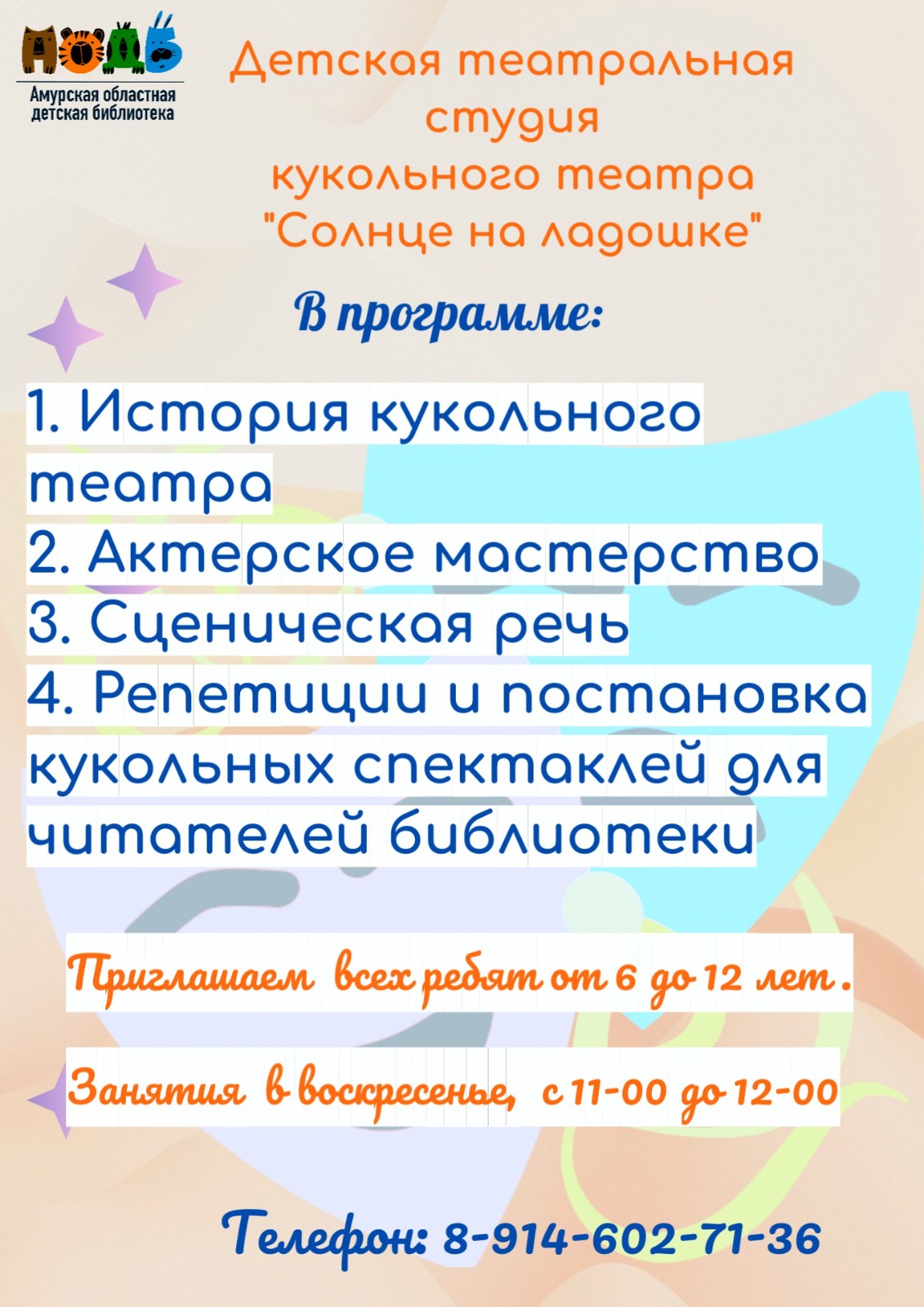 Амурская областная детская библиотека приглашает родителей с детьми от 2-х до 4-х лет на игровые занятия детской студии «Развивай-ка». ЗАНЯТИЯ ВКЛЮЧАЮТ: - Музыкально - ритмические упражнения; ...